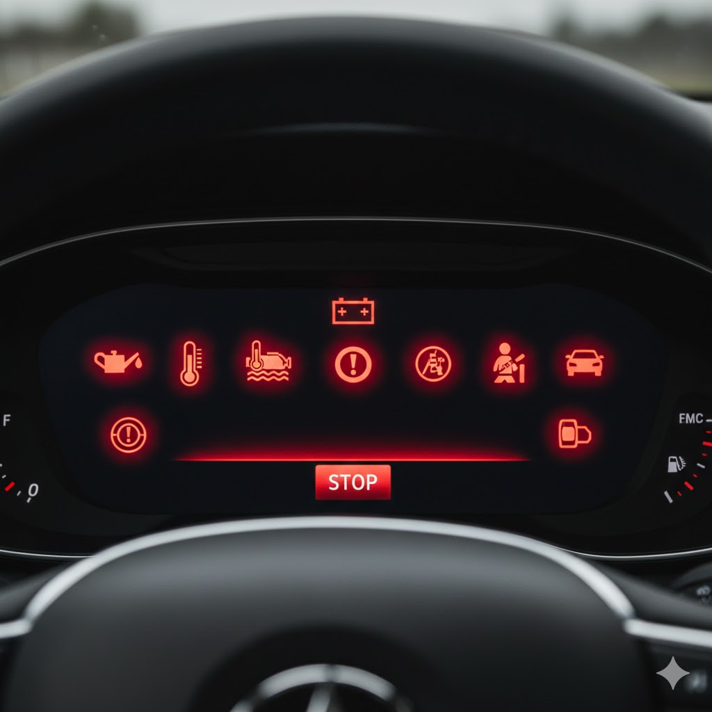 Pression d’huile moteur : votre moteur n'est plus lubrifié. Risque de serrage moteur imminent. Action : coupez le contact et vérifiez le niveau. Un remplacement moteur peut coûter entre 4 000 et 10 000 euros selon les données moyennes 2024 du comparateur IdGarages.